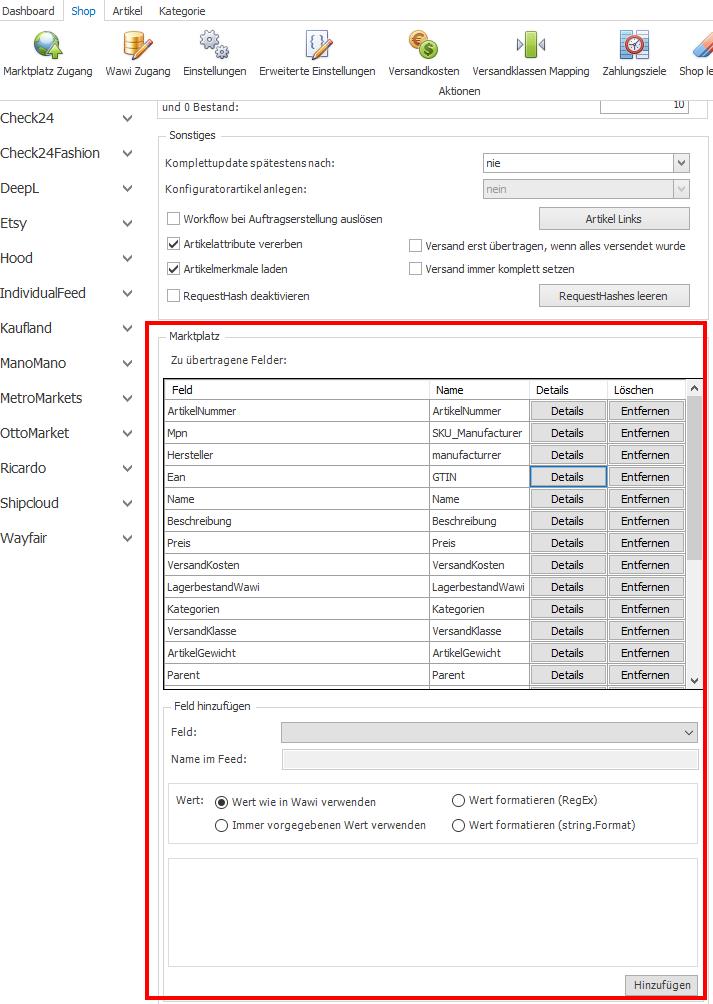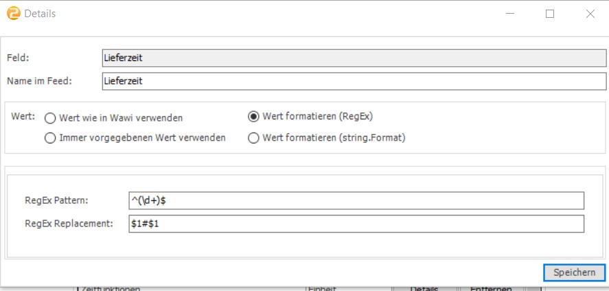 Dies ist ein mächtiges Werkzeug. Du kannst die Daten aus der Wawi anpassen. Hierfür findest du Möglichkeiten im Internet, wie der Regexausdruck angewandt werden kann. Wichtig ist, es wird unterschieden in RegEx Pattern und RegEx Replacement.