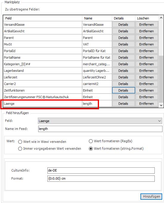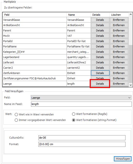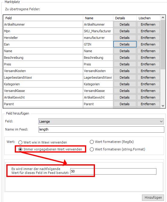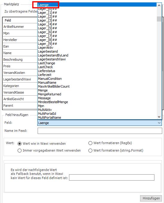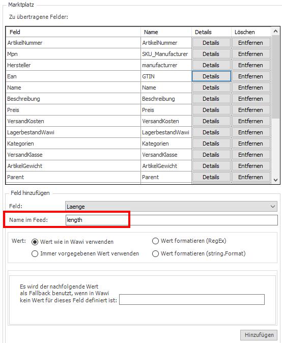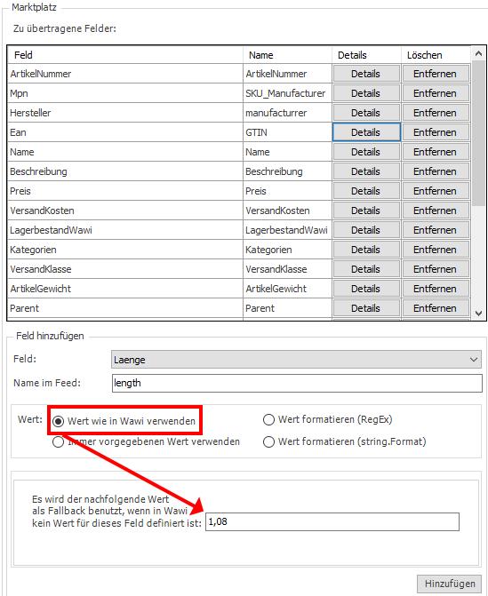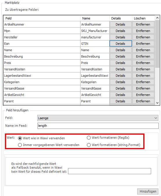 hier wird der Wert im JTL-Wawi Feld oder dem Attribut übernommen. Sollte das Feld leer sein, kann ein Fallback-Wert hinterlegt werden.