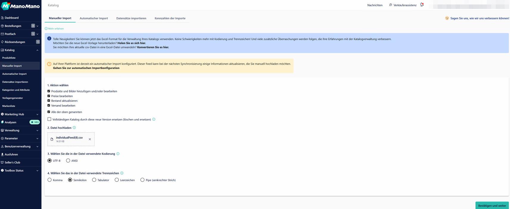 Wenn die Datei fehlerlos hochgeladen wird, kann man für die gepflegten Kategorien unter "Automatischer Import den Feed-Link hinterlegen. Siehe Wie kann ich ManoMano mit unicorn 2 anbinden?