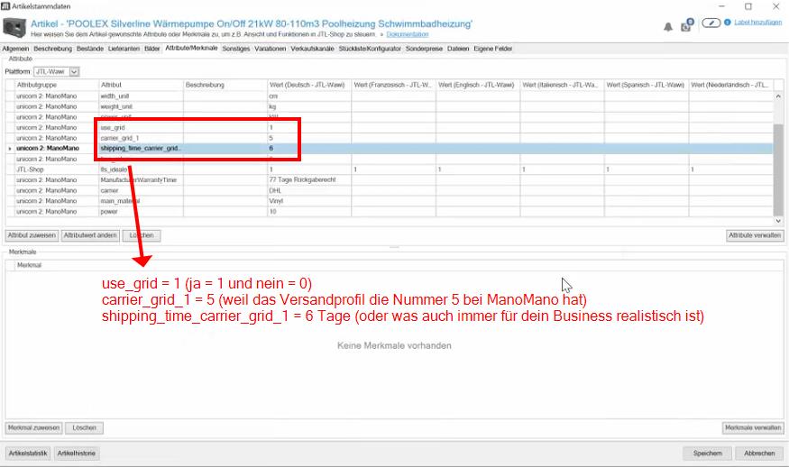 Die Individualisierung lässt dich jede Information hochladen, daher benötigt es unterschiedliche Attribute. Beispielsweise wirst du für den Versand zukünftig das Attribut carrier_grid_x und shipping_time_carrier_grid_x benutzen können. Diese beiden Attribute legst du in der Wawi an. Das X steht für die Nummer, die du im ManoMano-Backend siehst für die hinterlegten Versandinformationen