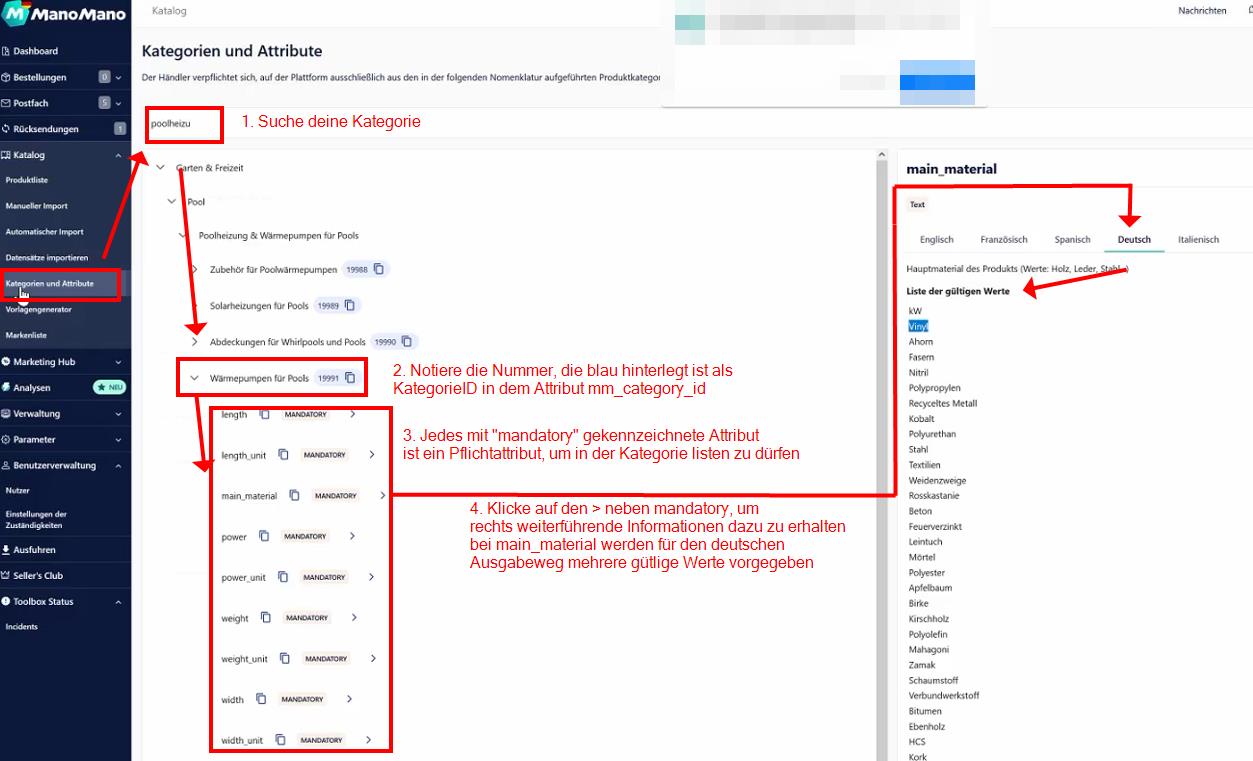 Innerhalb der Kategorie gibt es Informationen zu den Pflichtangaben, jedwedes Attribut, welches MANDATORY ausgewiesen wird, ist ein Pflichtattribut und muss angegeben werden. In den meisten Fällen werden hierfür gültige Werte, die ManoMano akzeptiert, angegeben. Dafür klickst du auf den Pfeil hinter dem Attribut und kannst dir auf dem rechten Teil des Bildschirms dann die weiterführenden Informationen in unterschiedlichen Sprachen anschauen.