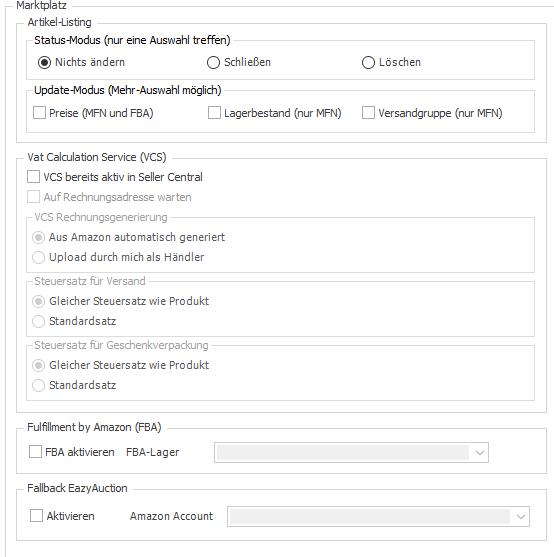 Die marktplatzspezifischen Einstellungen wurden entsprechend in der Konfigurationsübersicht unten separiert aufgeführt: