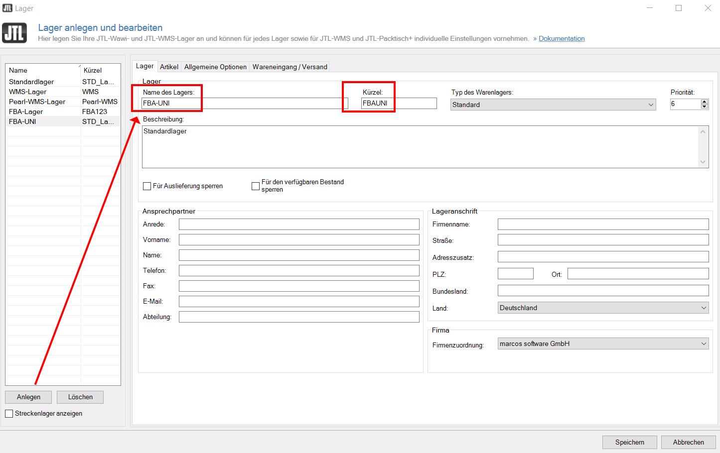 2. Lege in JTL-Wawi ein weiteres Lager an. Benenne es eindeutig als FBA-Lager, das unicorn2 bebuchen kann, z.B. FBA-UNI. Der Name wird nur für interne Zwecke genutzt, es soll dir helfen dies eindeutig zu identifizieren. Der Name wird nicht zum Upload genutzt.
