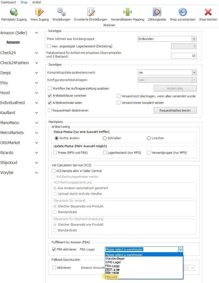 5. Wähle dahinter im Dropdownmenü "FBA-Lager" dein neues FBA-Lager (FBA-UNI) aus.