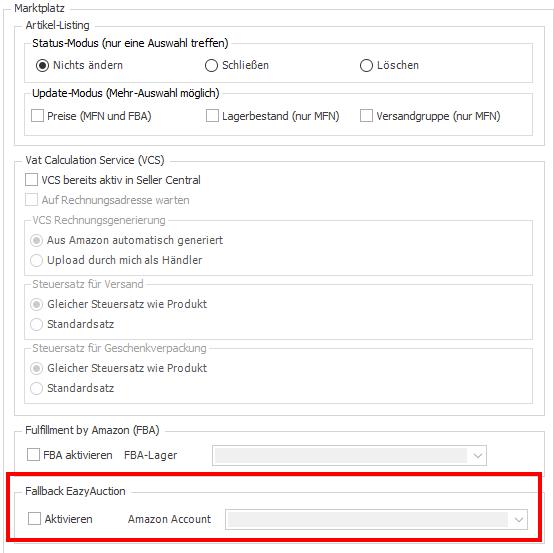 Dann nutze deine bisherigen Informationen, die du für EazyAuction gesetzt hast in der Waw indem du bei "Aktivieren" den Haken setzt. Hinterlege im Dropdown-Menü dahinter bitte noch deinen Amazon-Accountnamen mit dem du gearbeitet hast.