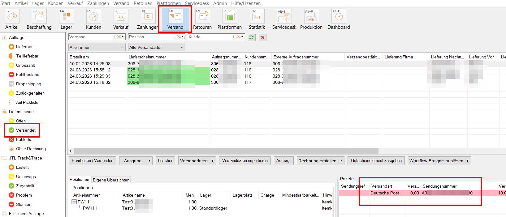 Wie bereits erwähnt, werden deine FBA-Bestellungen in die JTL-Wawi angelegt, da hier aber keinerlei Versand aus deinem eigenen Lager erfolgt, importieren wir sobald die Daten verfügbar sind, diese auch in die JTL-Wawi und verändern den Versandstatus auf "verpackt und versendet" mit den entsprechenden Daten, die Amazon uns überlässt (Tracking-ID, Versandtag etc.)